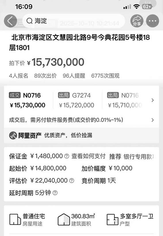 记者在阿里资产平台看到,一处位于北京市海淀区文慧园北路9号的房产以1573万元成交,明显低于市场价。该房产出让方为南京银行股份有限公司,面积为360多平方米,共有4位竞拍者进行了89次出价,吸引了6700余人围观。