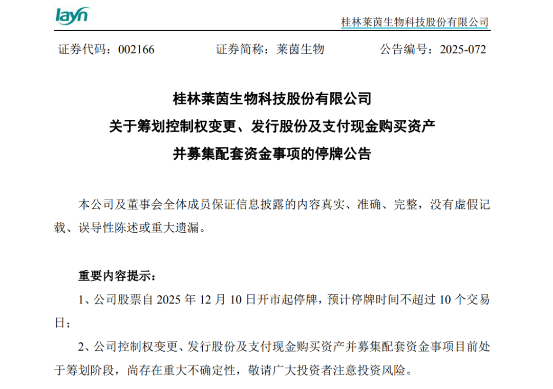 【导读】莱茵生物实控人正在筹划公司控制权变更事宜,股票停牌