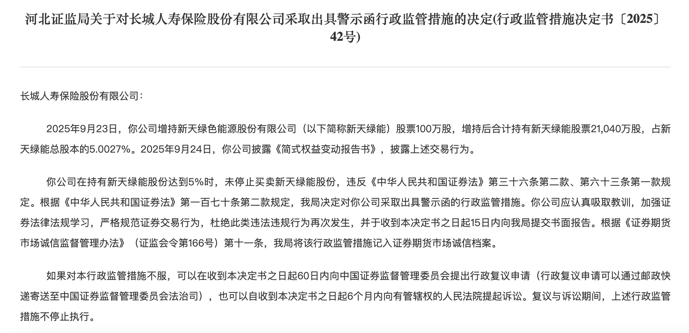 12月9日,河北证监局发布《关于对长城人寿保险股份有限公司采取出具警示函行政监管措施的决定》称,2025年9月23日,长城人寿增持新天绿色能源股份有限公司(简称“新天绿能(600956.SH)”)股票100万股,增持后合计持有新天绿能股票21,040万股,占新天绿能总股本的5.0027%。2025年9月24日,长城人寿披露《简式权益变动报告书》,披露上述交易行为。