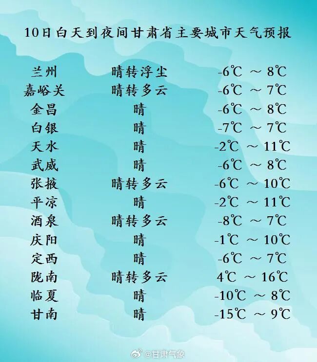 12月10日20时—12月11日20时,酒泉、嘉峪关、张掖三市多云转阴,部分地方有小雪;陇南、天水、平凉三市多云转阴,局部地方有小雨(雪)或雨夹雪;省内其余地方晴转多云。另外,河西五市及白银市有4-5级西北风,局部地方伴有短时沙尘天气,天水、陇南两市部分地方有4-5级偏南风。