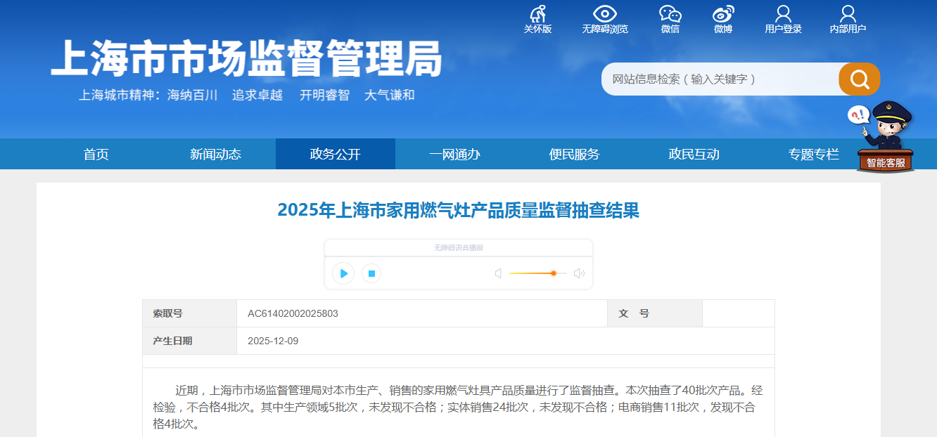 中国质量新闻网讯 近日,2025年上海市家用燃气灶产品质量监督抽查结果公布。