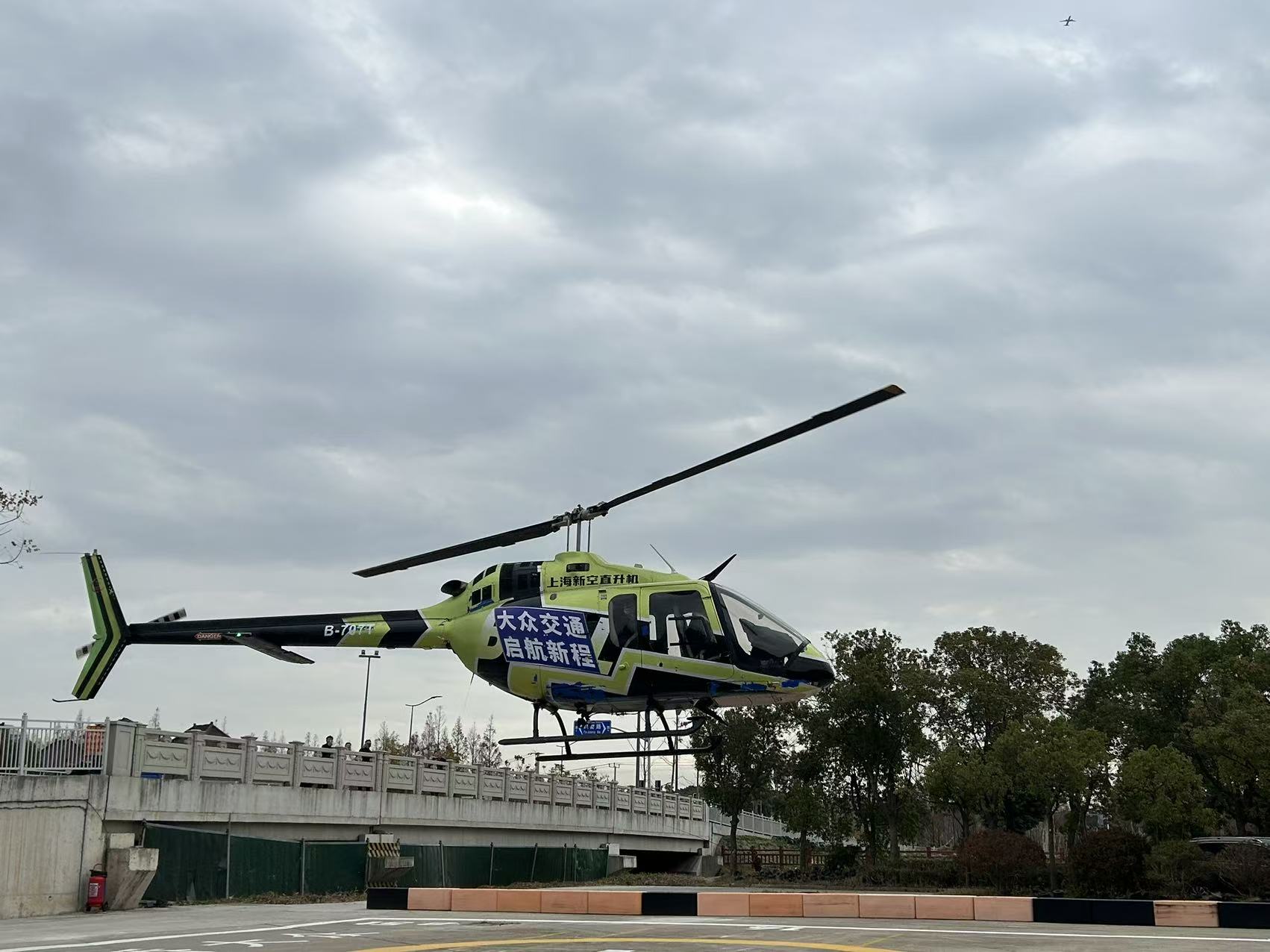12月10日上午,青浦区华新镇北青公路大众驾校内的虹桥大众起降点,一架贝尔505直升机搭载首批乘客腾空而起。12分钟后,飞机稳稳降落在苏州起降点——“虹桥大众-苏州”航线顺利完成首次飞行。