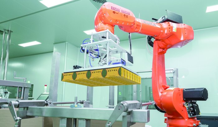 自“三期工程”投产以来,为确保工艺质量持续稳定可控,白云山中一、白云山奇星组织设备、工艺、质量等部门技术骨干开展联合攻关,融合老字号的传统经验与现代技术,实施了一系列设备改进与工艺创新。通过引入先进的传感检测器、机器人装备和信息化手段,实现了新一代信息技术与先进制造的深度融合,设计了从自动上料到机器人装箱的连续制造工艺,顺利实现了滋肾育胎丸、华佗再造丸等丸剂产品的数字化和自动化包装生产。