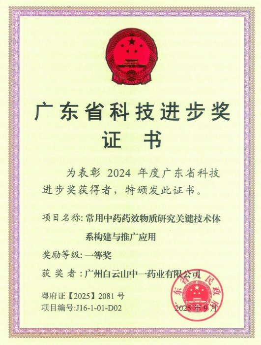 近日,白云山中一、白云山奇星与暨南大学等联合申报的“常用中药药效物质研究关键技术体系构建与推广应用”项目荣获2024年度广东省科技进步奖一等奖。图为获奖证书。广药集团供图