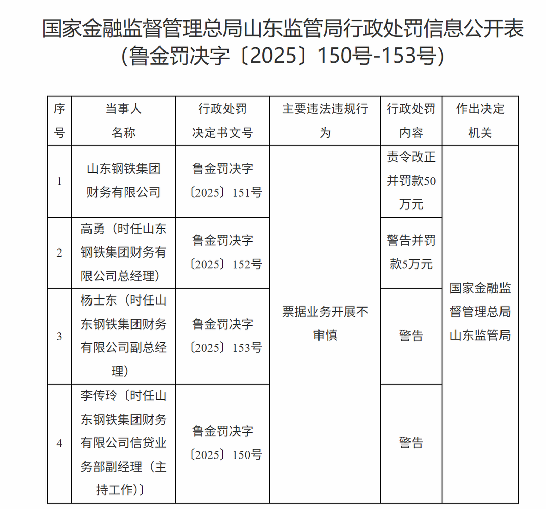 行政处罚决定信息公示表(鲁金罚决字〔2025〕150号-153号)显示,因票据业务开展不审慎,山钢集团财务公司被责令改正并罚款50万元,时任山钢集团财务公司总经理高勇被警告并罚款5万元,时任山钢集团财务公司副总经理杨士东被警告,时任山钢集团财务公司信贷业务部副经理(主持工作)李传玲被警告。
