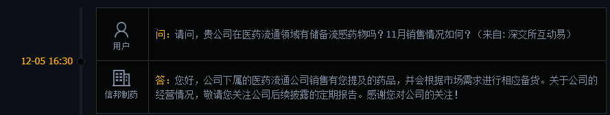 近日在互动平台,投资者曾询问,公司在医药流通领域是否有储备流感药物。信邦制药回应称:“公司下属的医药流通公司销售有您提及的药品,并会根据市场需求进行相应备货。”