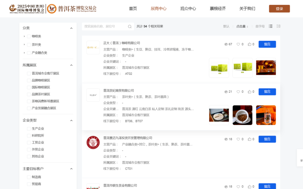 2025普洱茶咖博览会线上数字展览系统如期上线,构建起官网(PC端)、小程序、手机端(H5)三端融合的展示矩阵,通过全功能覆盖、全时段服务、全链路对接,打造出“永不落幕”的线上茶咖经贸新平台。