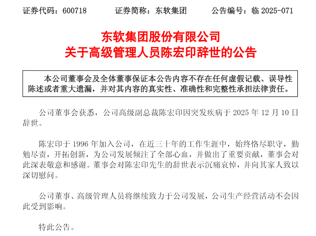 12月11日,“中国软件第一股”,A股外包软件巨头东软集团(600718.SH)公告称,公司董事会获悉,公司高级副总裁陈宏印因突发疾病于2025年12月10日辞世。