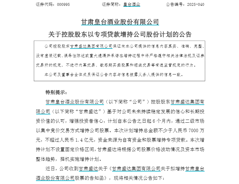 在行业复杂调整时期,也有企业获得了来自股东层面的坚定支持。在甘肃皇台酒业市场表现持续走低的情况下,其控股股东盛达集团于11月17日宣布计划在6个月内,用自有资金和专项贷款,通过二级市场集中竞价交易方式增持公司股票,计划增持总金额7000万元至1.4亿元。