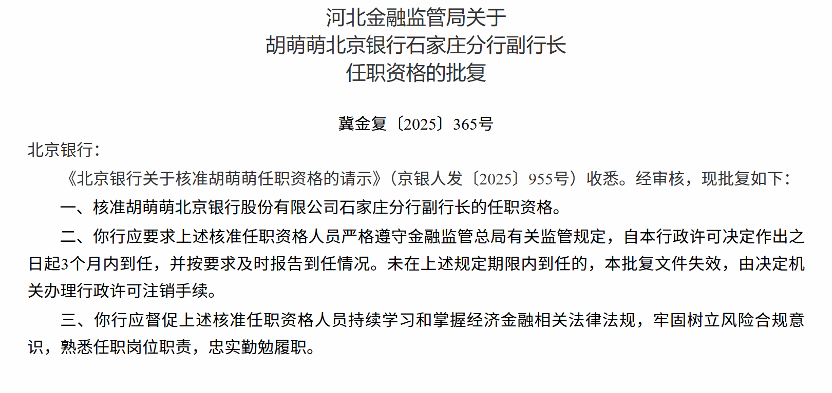 石家庄分行副行长任职资格的批复,核准胡萌萌北京银行股份有限公司石家庄分行副行长的任职资格。
