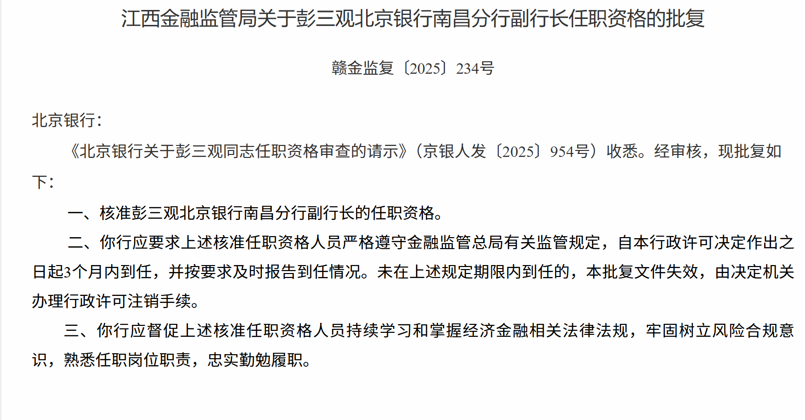 南昌分行副行长任职资格的批复,核准彭三观北京银行南昌分行副行长的任职资格。