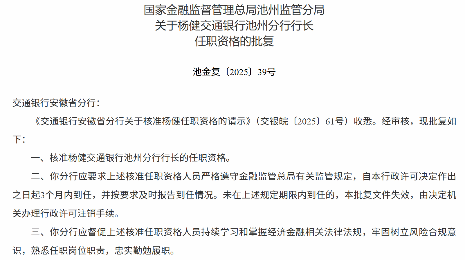 池州分行行长任职资格的批复,核准杨健交通银行池州分行行长的任职资格。