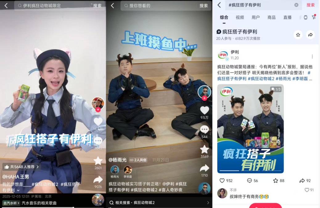 比如,伊利疯狂动物城2系列与王男、杨雨光、李明磊合作的广告短片,就被收录在官方相关话题之下,#疯狂搭子有伊利抖音相关话题播放热度高达6182.9万次。