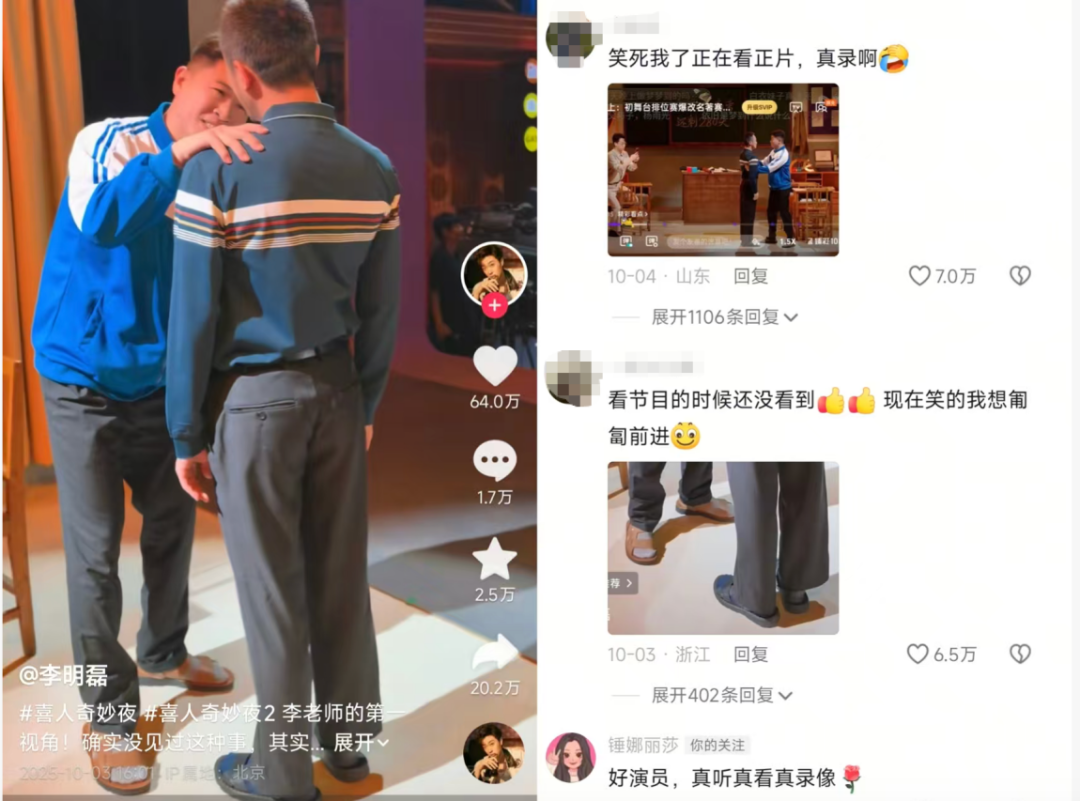 比如在《开学第一天》的节目录制过程中,演员李明磊就将在录制过程中的现场视频发布至其个人社交媒体账号,得到了网友热议。更有网友从这一视频中找到了新的细节化“笑点”。
