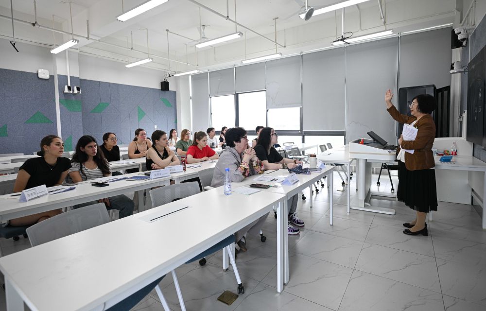 ↑ 在海南自贸港重点园区——陵水黎安国际教育创新试验区,北京语言大学海南国际学院的老师给外籍学生上中文听说课(11月5日摄)。