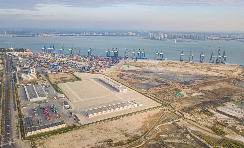 ↑ 在海南自贸港重点园区——洋浦经济开发区拍摄的洋浦保税港区,远处即是国投洋浦港(无人机照片,11月21日摄)。