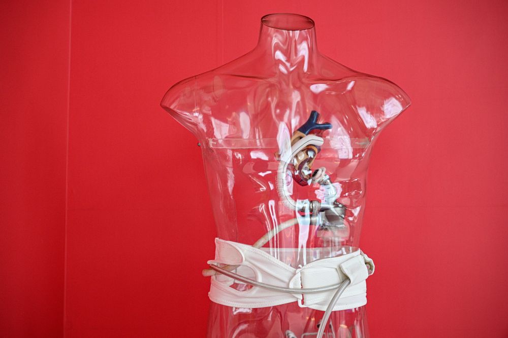 ↑ 在海南自贸港重点园区——博鳌乐城国际医疗旅游先行区举办的“永不落幕”国际创新药械展上拍摄的植入式左心室辅助系统,该系统俗称“人工心脏”(10月27日摄)。