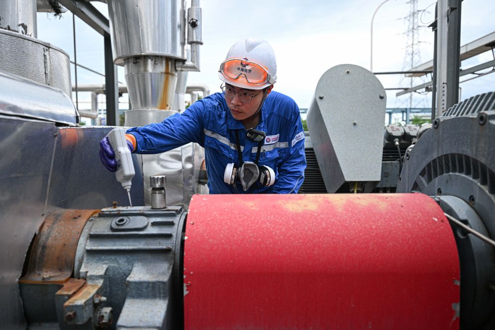 ↑ 在海南自贸港重点园区——东方临港产业园内,中海油富岛(海南)化工有限公司的工人对丙烯腈联合装置开展巡检(11月7日摄)。