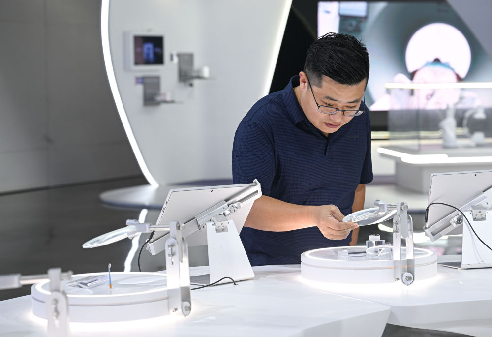↑ 观众在海南自贸港重点园区——博鳌乐城国际医疗旅游先行区观看“永不落幕”国际创新药械展(10月27日摄)。