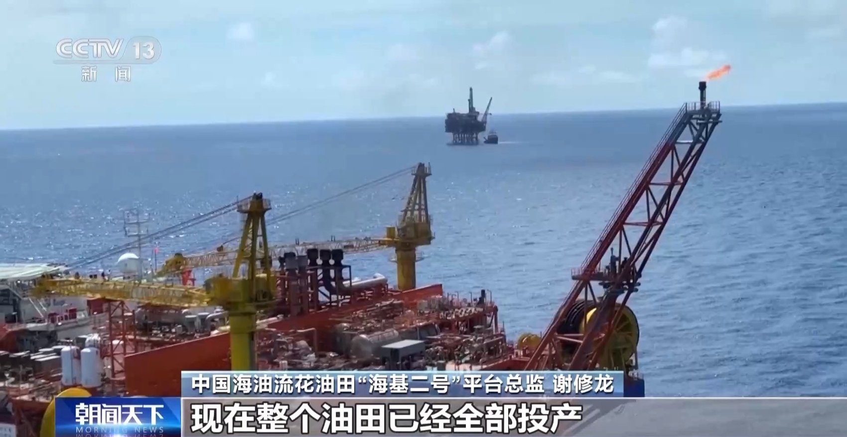 中国海油流花油田“海基二号”平台总监 谢修龙:原油在“海基二号”平台经过初步处理后,输送到2.5公里外的海上油气加工厂“海葵一号”做进一步加工和储存。截至目前,我们已经累计向陆地炼油厂输送了25船次的原油。现在油田已全面投产,开发效果好于预期,日产量创下了我们油田22年来的新高。