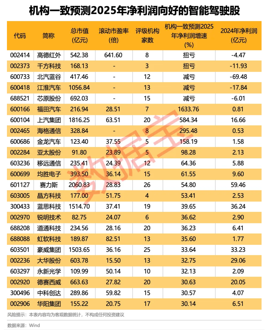 根据3家及以上机构一致预测,在2024年同期盈利的基础上,2025全年净利润增速有望超过30%的智能驾驶股共计19只。福田汽车、上汽集团、海格通信、金龙汽车净利润增长翻倍,同比增速依次为1633.76%、584.34%、295.48%、158.19%。此外,高德红外、千方科技等则有望扭亏为盈。