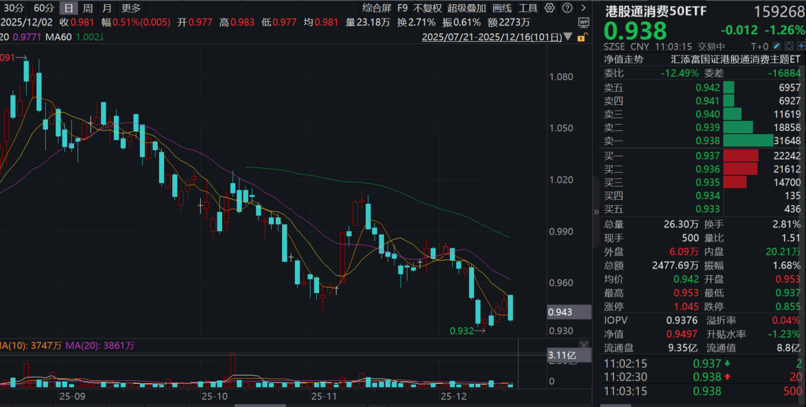 港股新消费亦飘红,港股通消费50ETF(159268)跌超1.2%,盘中成交额超2500万元!资金面上,港股通消费50ETF(159268)近5日有3日获净流入,累计“吸金”超4700万元!港股新消费概念股多数飘绿:泡泡玛特、李宁跌超2%,安踏体育跌超1%,海底捞、蒙牛乳业、老铺黄金微跌(标的指数成分股仅做展示,不作为个股推介)。