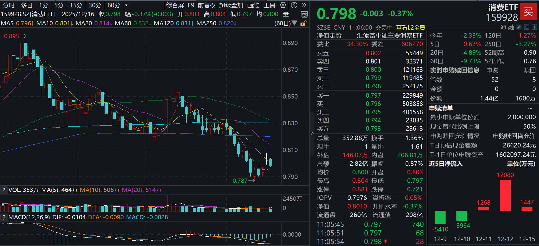 今日(12.16),沪指跌超1%,大消费板块跌幅相对较小,扛压能力明显,消费ETF(159928)小跌0.37%,盘中成交额已超3亿元!资金大举涌入,消费ETF(159928)盘中再获净申购1.28亿份!