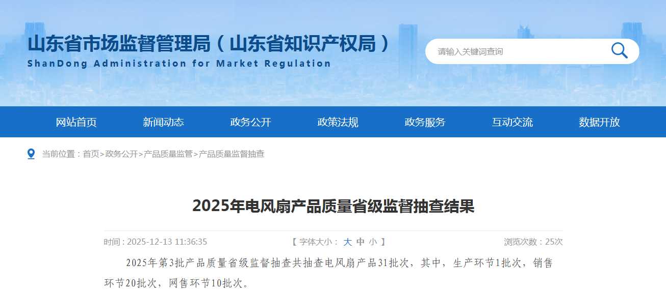 中国质量新闻网讯 据山东省市场监督管理局网站消息,近日,山东省市场监督管理局公布2025年电风扇产品质量省级监督抽查结果。2025年第3批产品质量省级监督抽查共抽查电风扇产品31批次,其中,生产环节1批次,销售环节20批次,网售环节10批次。