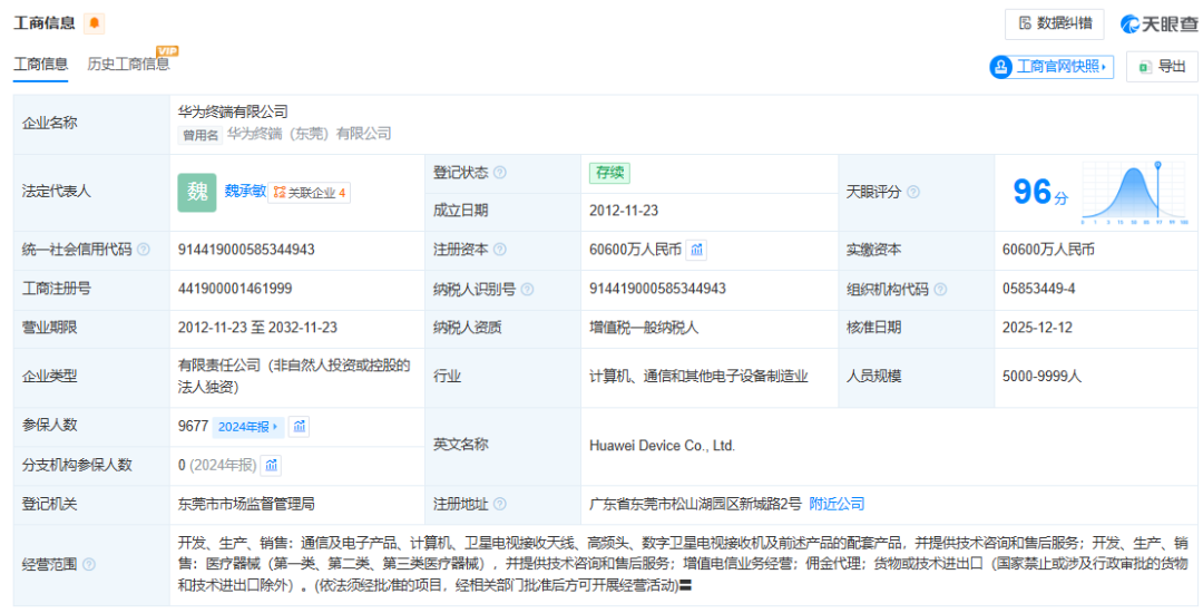 华为终端有限公司成立于2012年11月,法定代表人为魏承敏,注册资本6.06亿人民币,经营范围含开发、生产、销售通信及电子产品、计算机、卫星电视接收天线、高频头、数字卫星电视接收机及前述产品的配套产品,并提供技术咨询和售后服务等。股东信息显示,该公司由华为终端(深圳)有限公司全资持股。