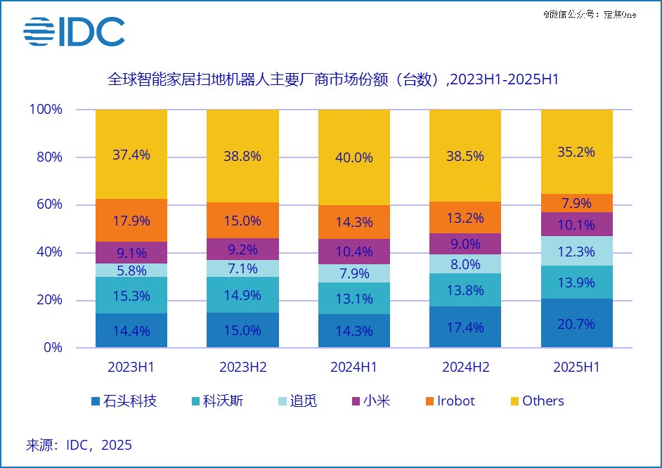 2025年上半年,IDC的数据显示,iRobot的全球份额已萎缩至7.9%,位列第五。而到了2025年第三季度,全球出货量前五的席位已被中国品牌(石头、科沃斯、追觅、小米、云鲸)包揽。iRobot彻底被挤出*阵营。
