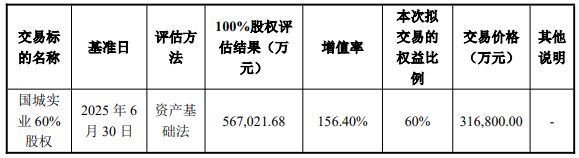 每经记者注意到,本次交易中,标的资产评估基准日为2025年6月30日,立信评估采用资产基础法和收益法对标的公司股东全部权益价值进行评估,国城实业100%股权评估结果为56.70亿元,估值增值率达156.40%。