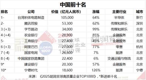 据悉,本次榜单主要以企业市值或估值为依据,并综合考量创新能力、可持续发展、社会责任、市场影响力等多维度指标。上市公司市值按照2025年11月14日的收盘价计算,非上市公司估值参照同行业上市公司或最新一轮融资情况进行估算。