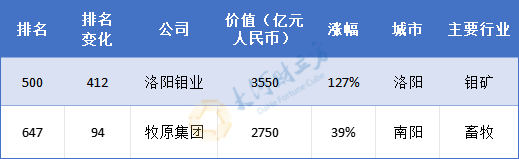 记者梳理发现,本次河南有两家企业上榜,分别是洛阳钼业与牧原集团,以3550亿元和2750亿元的价值,在全球千强企业中位居第500名和第647名。