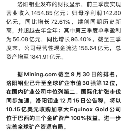 洛阳钼业,成功跻身这一全球顶尖企业榜单。