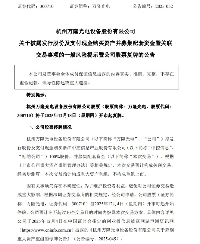 中控信息是一家国内领先的基础设施数智化服务商,为城市交通、轨道交通、公路交通、水环境、建筑智能体等基础设施领域客户提供数智化技术与产品服务。通过本次跨行业重组,万隆光电将加快向新质生产力转型步伐,新增基础设施数智化业务板块,增加新的利润增长点,打造第二增长曲线。公司股票将于2025年12月18日开市起复牌。