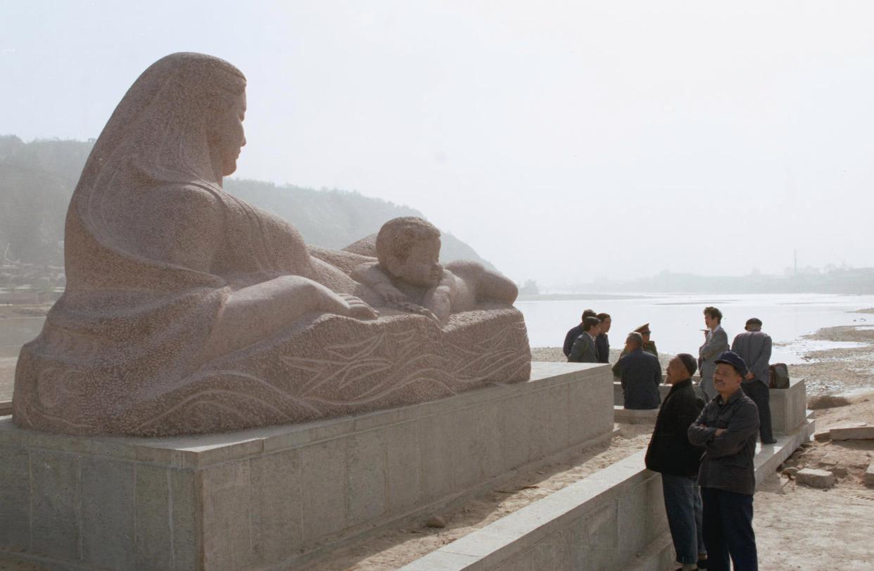 坐落在兰州市滨河中路黄河南岸的《黄河母亲》。新华社记者 李生才 摄(1986年5月21日发) 1986年,6米长的花岗岩雕塑《黄河母亲》在兰州黄河之滨落成。这座由普通花岗岩雕刻而成的作品,由母亲和孩子两部分组成。温暖慈祥的母亲静静看着臂弯中天真烂漫的孩子,身前是络绎不绝前来观赏的游客市民,身后是奔涌向前的滔滔黄河。