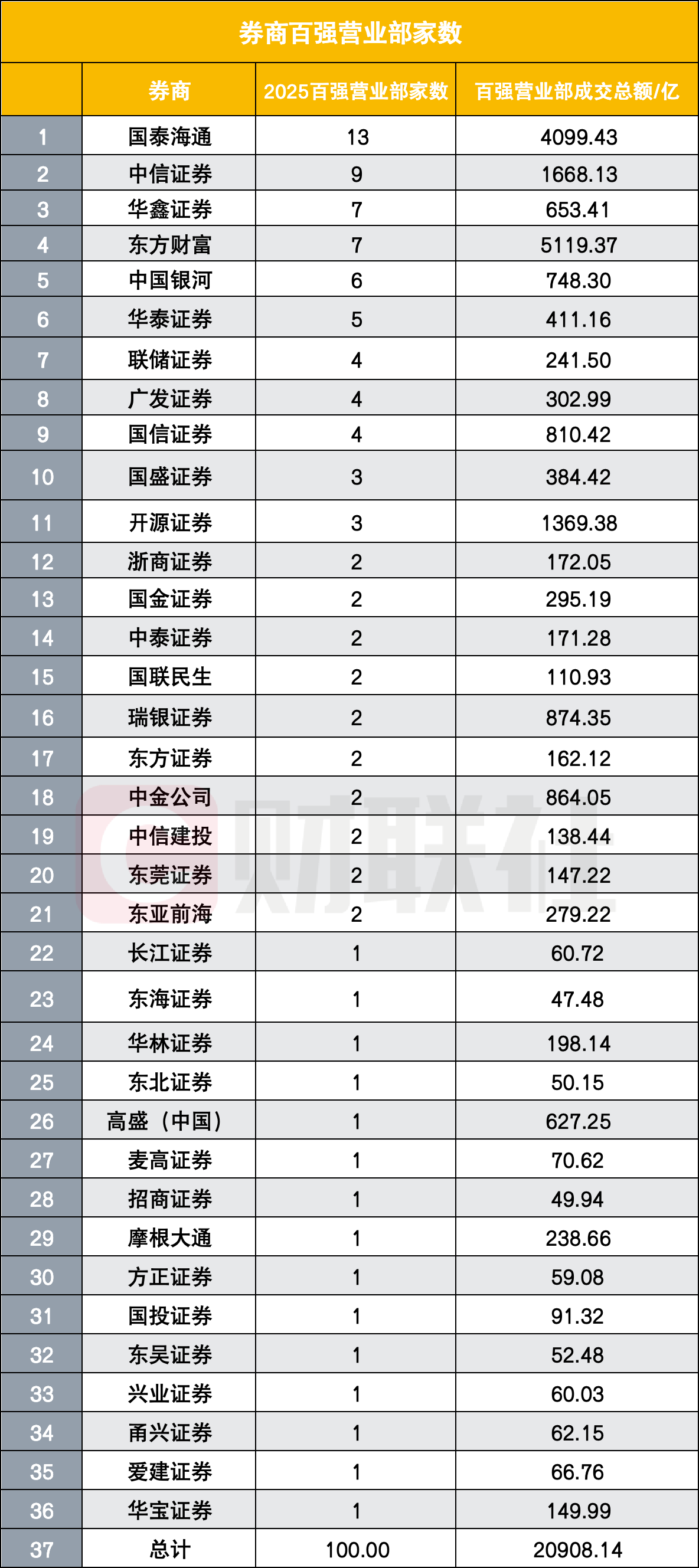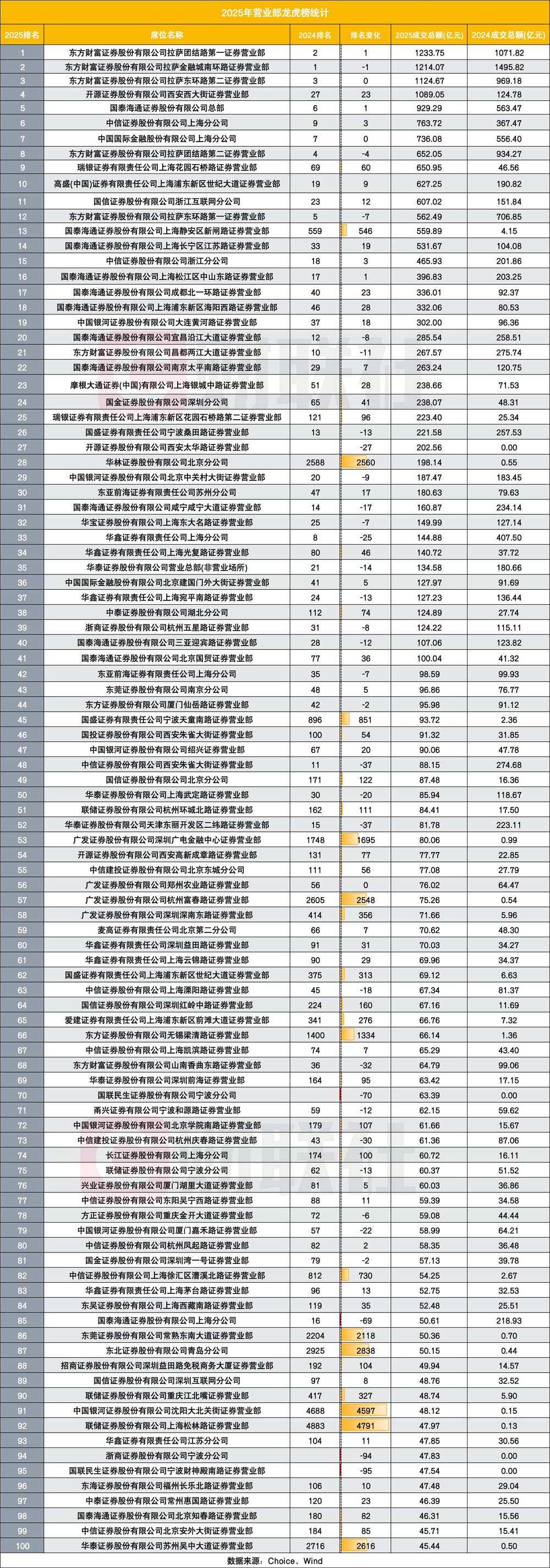 在2025年券商营业部百强榜中,东方财富继续保持领先地位,旗下7家营业部跻身百强,成交总额高达5119.37亿元,成为百强营业部中成交总额最高的券商。