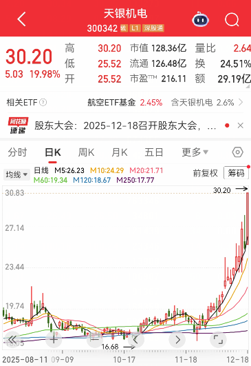 人民财讯12月18日电,12月18日早盘,商业航天概念股天银机电高开高走,并于10时左右封住“20cm”的涨停板,最新股价30.2元/股,创下历史新高。今年前三季度,公司实现净利润0.24亿元,同比下滑56.1%。