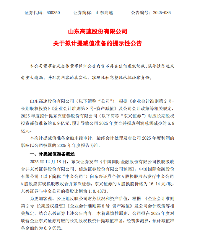 12月18日,山东高速(600350.SH)公告称,公司根据相关会计准则及政策,拟在2025年度对联营企业东兴证券(601198.SH)对应的长期股权投资计提减值准备,预计减值准备金额约为6.9亿元,预计导致公司2025年度合并报表利润总额减少约6.9亿元。最终计提金额以公司披露的2025年年度报告为准。
