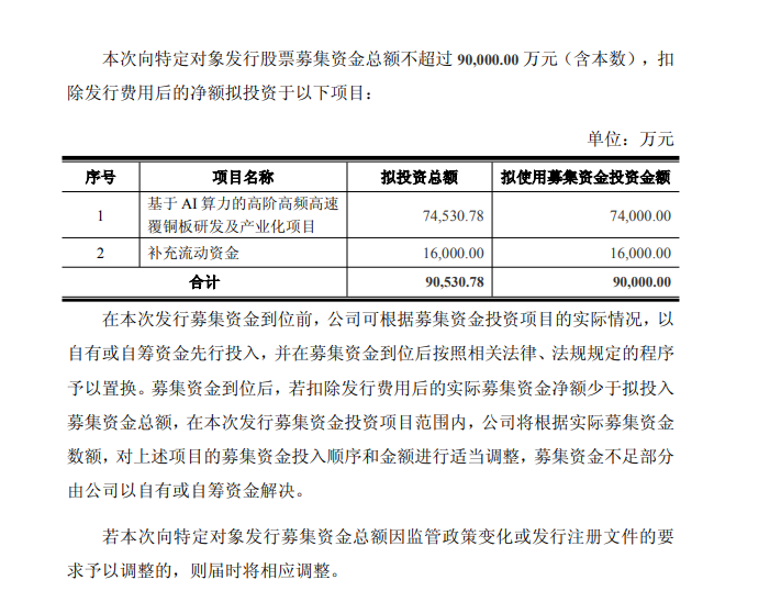 12月22日,南亚新材(688519.SH)公告称,公司董事会已审议通过关于公司符合向特定对象发行A股股票条件的议案。本次发行股票数量不超过7043.13万股,募集资金总额不超过9亿元,用于基于AI算力的高阶高频高速覆铜板研发及产业化项目和补充流动资金。发行对象为不超过35名符合法律法规规定的特定对象。本次发行前公司滚存未分配利润由本次发行完成后的新老股东共享。