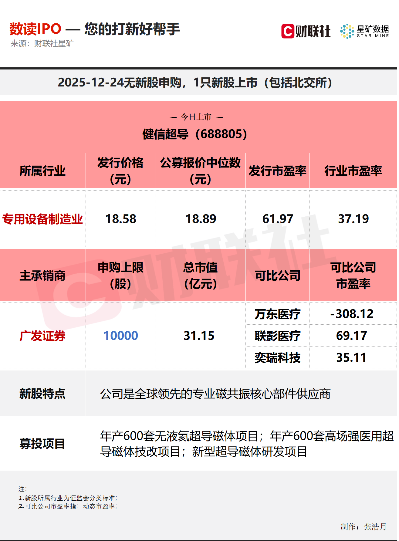 财联社12月24日讯,今日无新股申购;有1只新股上市,为科创板的健信超导。