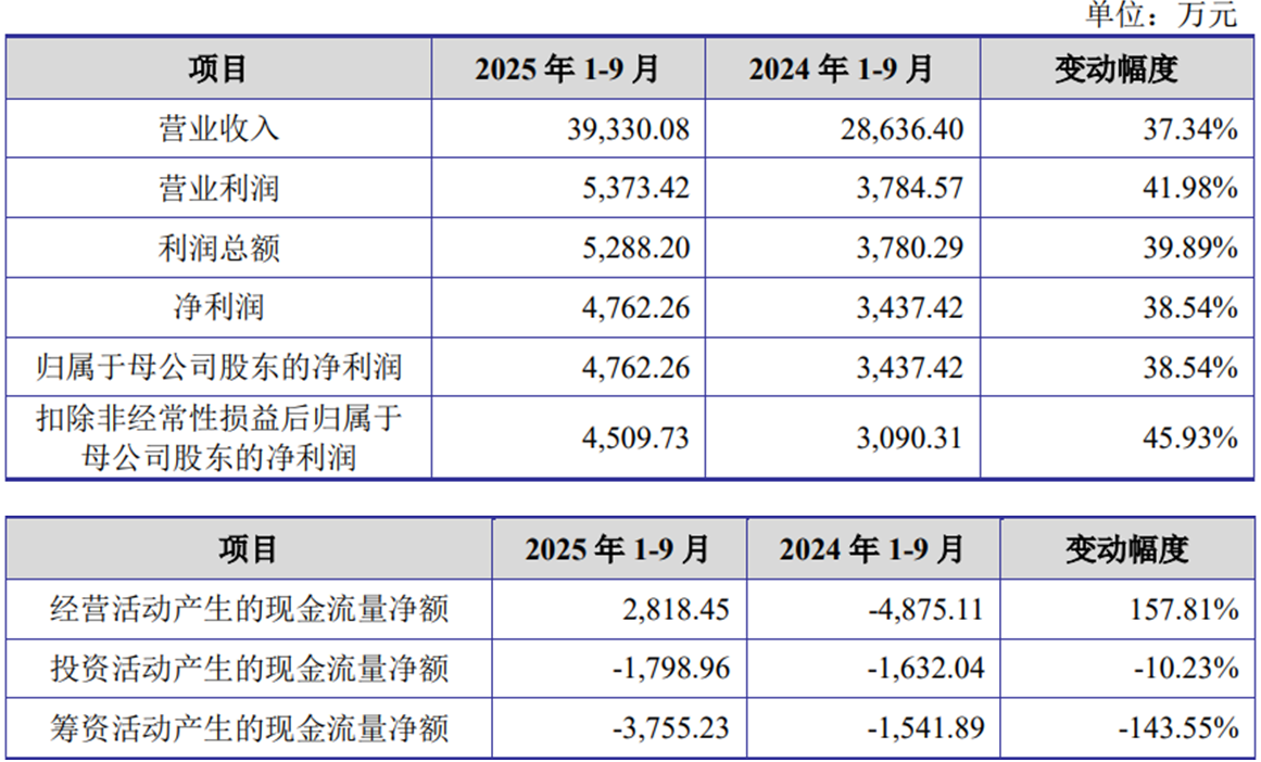 2025年1-9月,健信超导的营业收入为39,330.08万元,同比增长37.34%;净利润/归属于母公司所有者的净利润为4,762.26万元,同比增长38.54%;扣除非经常性损益后归属于母公司股东的净利润为4,509.73万元,同比增长45.93%;经营活动产生的现金流量净额为2,818.45万元,同比增长157.81%。