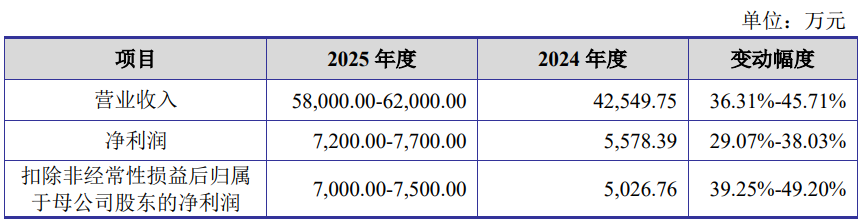 公司预计2025年度实现的营业收入为58,000.00万元至62,000.00万元,同比增长36.31%至45.71%;预计净利润为7,200.00万元至7,700.00万元,同比增长29.07%至38.03%;预计扣除非经常性损益后归属于母公司股东的净利润为7,000.00万元至7,500.00万元,同比增长39.25%至49.20%。