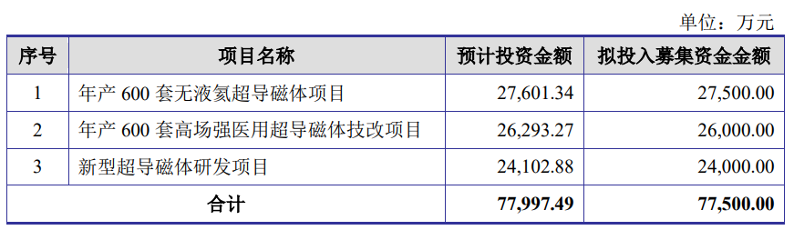 健信超导本次的募集资金总额为77,887.36万元,扣除发行费用后募集资金净额为68,864.27万元,比原计划少8,635.73万元。健信超导2025年12月19日披露的招股书显示,公司拟募集资金77,500.00万元,用于年产600套无液氦超导磁体项目、年产600套高场强医用超导磁体技改项目、新型超导磁体研发项目。