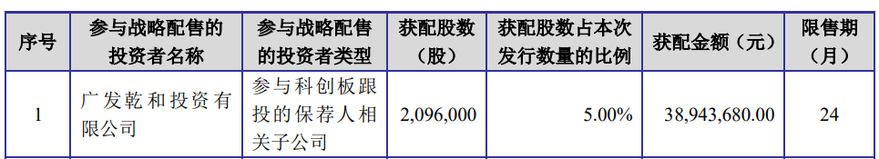 公告显示,保荐人的子公司广发乾和投资有限公司参与战略配售,获配股数2,096,000股,获配股数占本次发行数量的比例为5.00%,获配金额为38,943,680.00元。