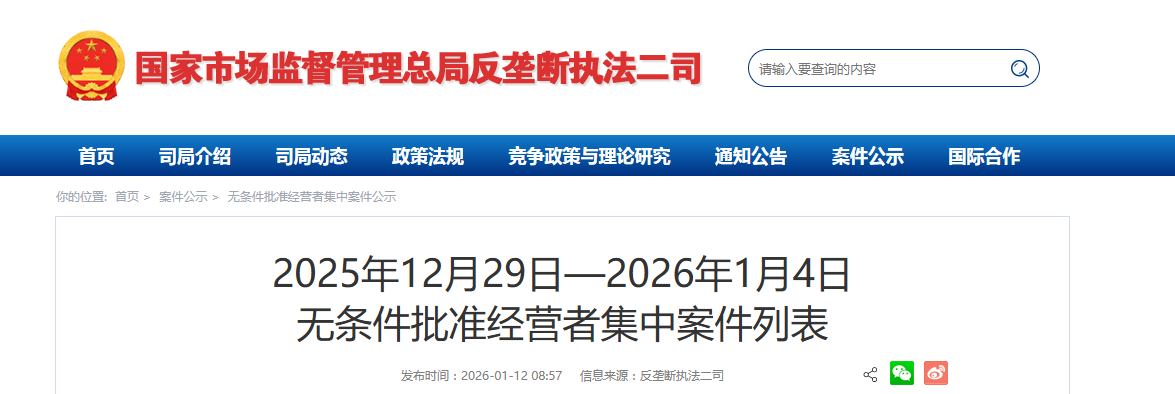 | 16 | 中国汽车技术研究中心有限公司收购长春汽车检测中心有限责任公司股权案 | 中国汽车技术研究中心有限公司,中国第一汽车集团有限公司 | 2026年1月4日 |