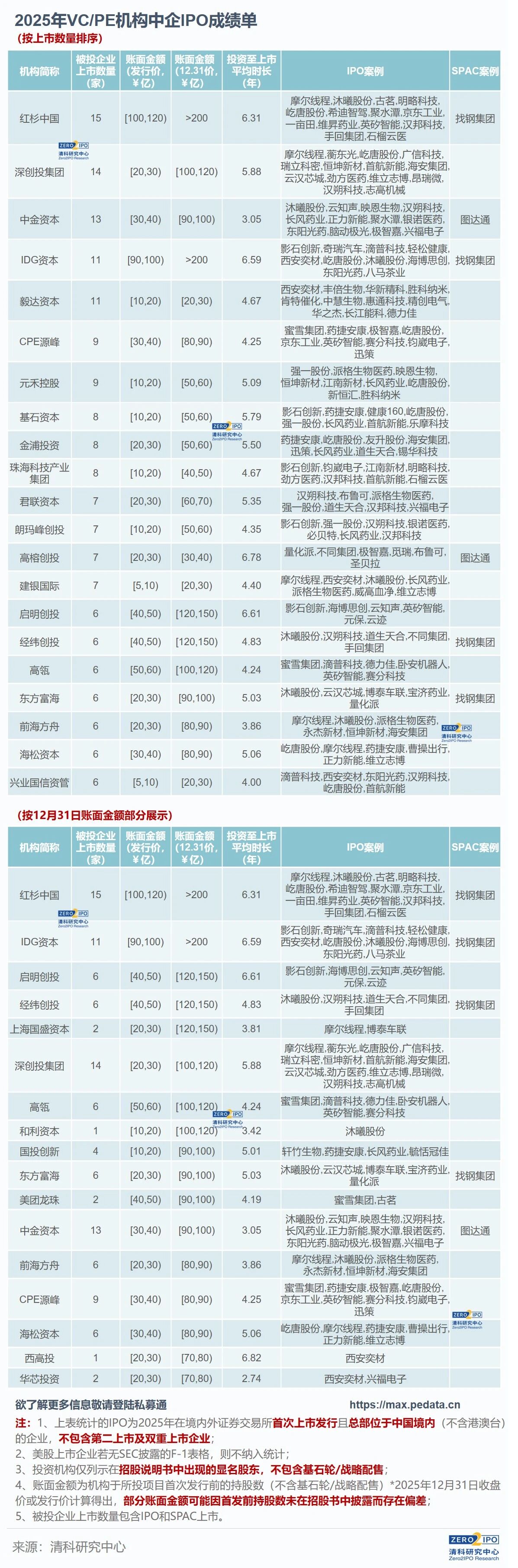 其一,头部机构收获IPO项目数量明显增长,账面金额表现良好。若包含SPAC上市在内,2025年共5家VC/PE机构(红杉中国、中金资本、深创投等)收获超10个IPO,而2024年仅1家;同时,本年度共26家机构收获5个及以上IPO,2024年为17家。账面金额方面,按年末收盘价计算,2025年持有新增IPO项目账面股份价值排名前10的机构合计持有账面金额达1457.25亿元人民币,远高于2024年的465.37亿元。