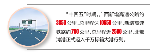 2025年是“十四五”规划收官之年。在这一年,全区建成高速铁路81公里、高速公路590公里、普通国省道303公里及20万吨级泊位3个、通用机场8个,快递业务量24.5亿件,南宁吴圩国际机场实现双跑道运行,我国第二条联通中越边境的高速铁路南宁至凭祥高铁全线贯通,平陆运河获茅以升科学技术奖一等奖,天峨龙滩特大桥获2020—2025年度十大最美桥梁、最佳结构设计奖。