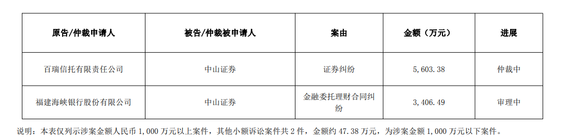 图源:公告其中,中山证券作为被告,还与百瑞信托、福建海峡银行存在纠纷,案由分别为证券纠纷和金融委托理财合同纠纷,涉诉金额分别为5603.38万元、3406.49万元,目前,两起案件均未作出裁定。