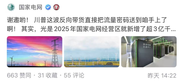 @国家电网 :谢邀哟!川普这波反向带货直接把流量密码送到咱手上了啊!其实,光是2025年国家电网经营区就新增了超3亿千瓦的风电+光伏装机。